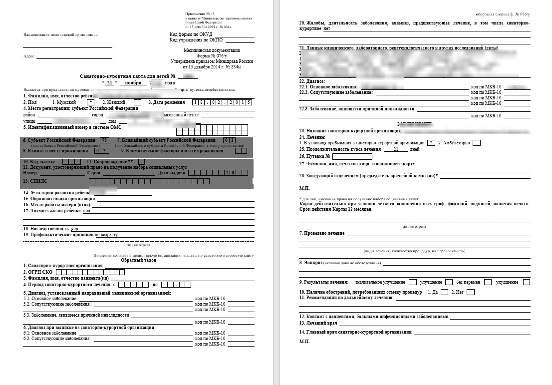 Отмечают социальные льготы, вносят сведения о родителях или опекунах, пишут название и адрес санаторно-курортного учреждения, срок нахождения в нем.