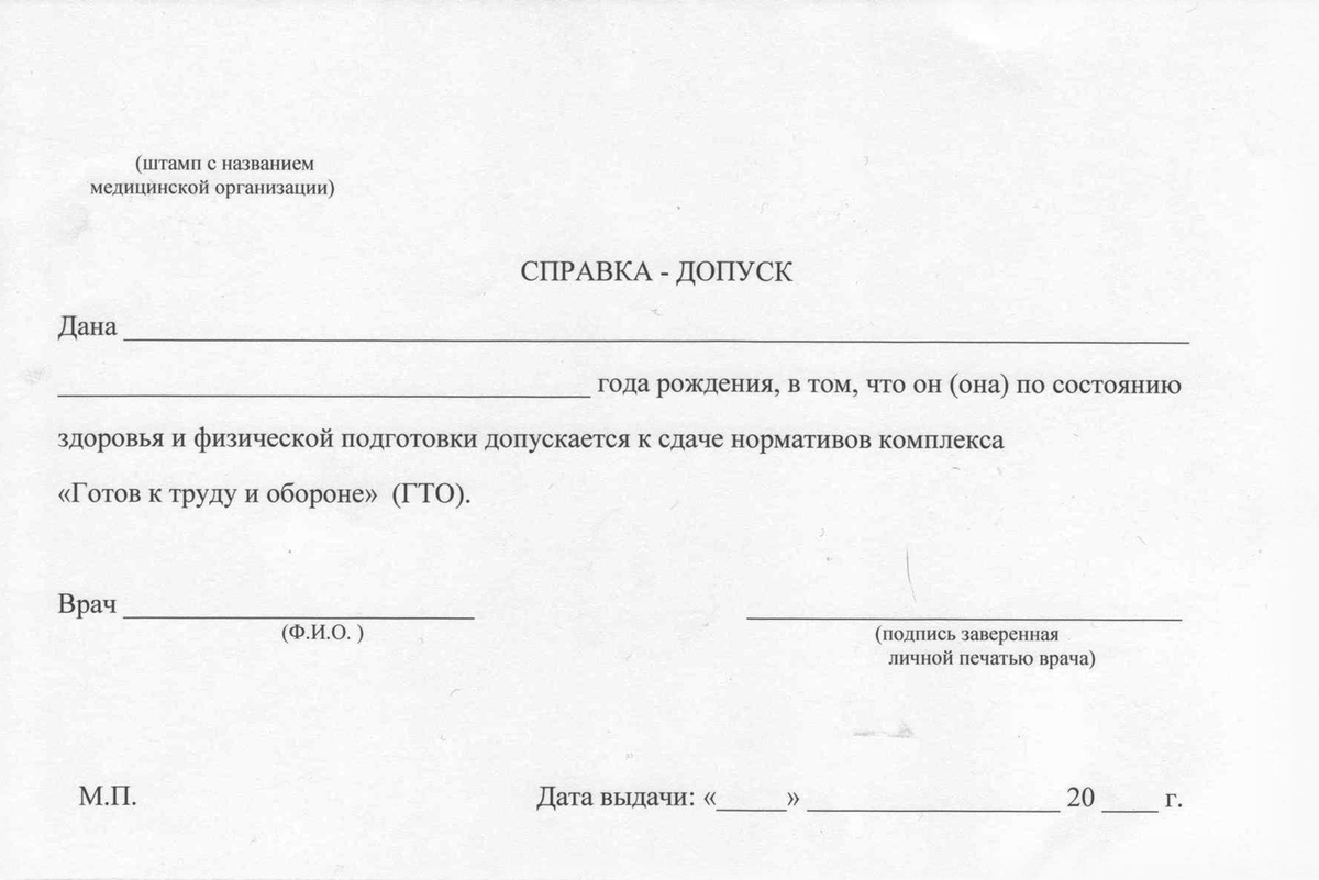 Документ нужен для прохождения тестов физической подготовки. Форма содержит заключение терапевта о допуске к сдаче норм ГТО. Наличие медицинской справки является обязательным требованием для всех участников тестирования — от школьников до взрослых, независимо от возраста и состояния здоровья.