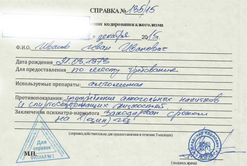 Справка о кодировке от алкоголизма