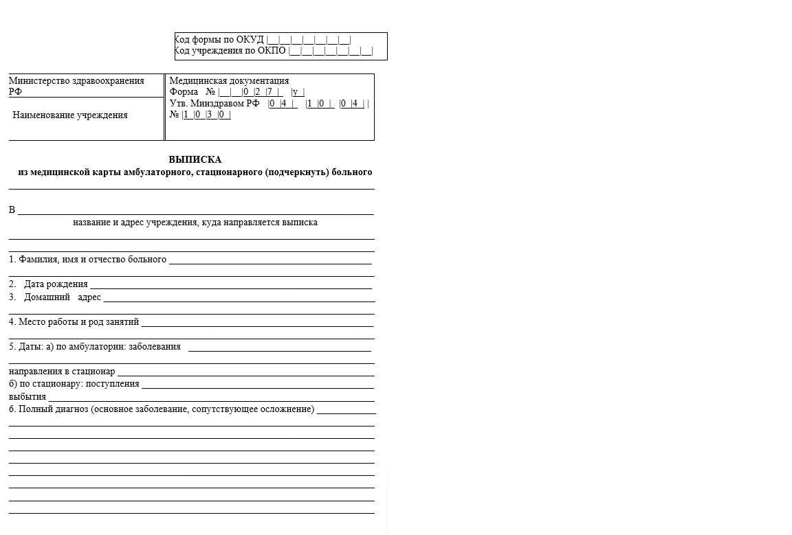 Справка формы 027/у иначе называется выпиской из истории болезни или амбулаторной карты. Заполняется на каждого больного, прошедшего курс лечения в любом стационаре, госпитале, диспансере. В бланке содержатся сведения о диагнозе, пройденных обследованиях и их результатах, рекомендации на восстановительный период.