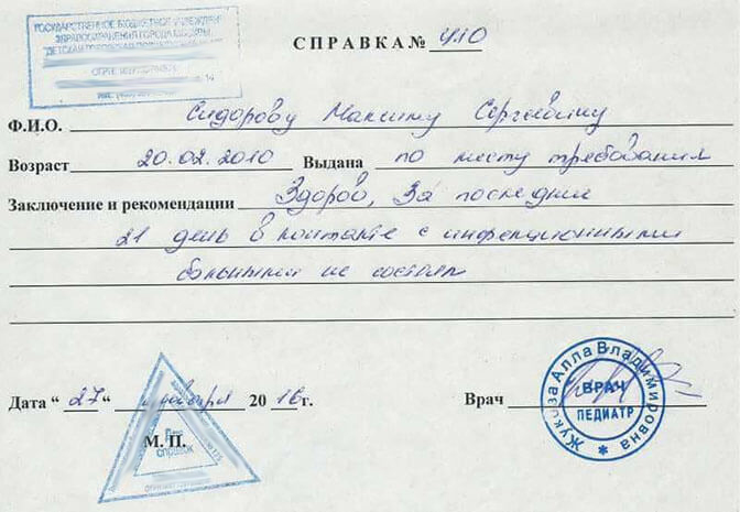 Для вашего комфорта можно купить справку от педиатра для посещения детского сада или школы. Это избавит Вас от необходимости возить детей в поликлинику. И вместо утомительного ожидания возле кабинета в очереди Вы можете посвятить время своей семье и заболевшему ребенку.